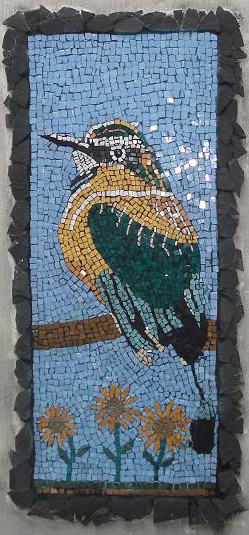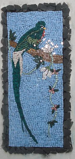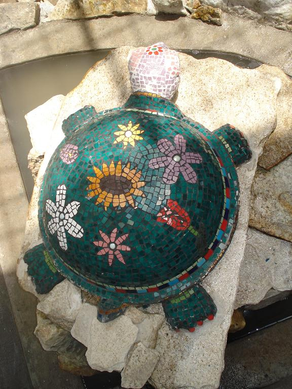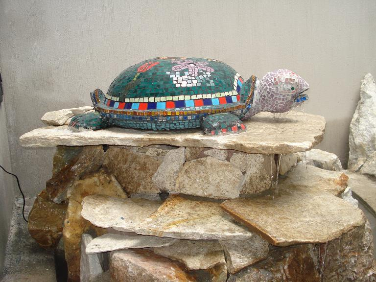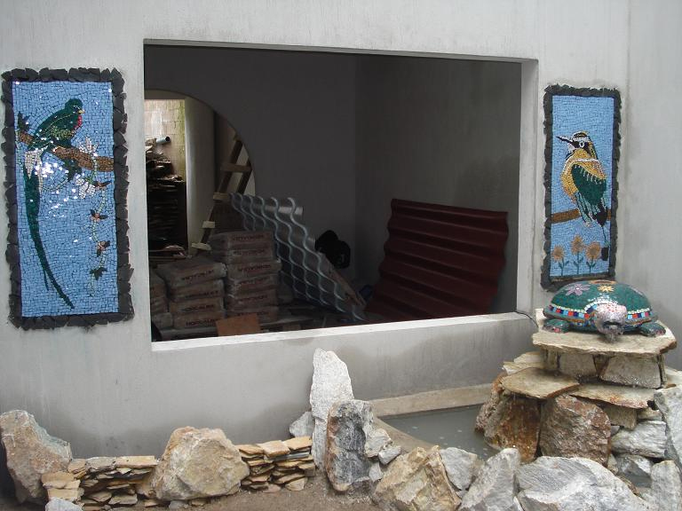 Full view of the turtle fountain created using Gaudinian technique, the bird mosaics I also created using the old mosaic technique with tessalas of 1cm or less, the fountain is built on marble or quartz rocks which are found in a mine in my country of El Salvador. The birds are a Quetzal and on the right a Torogoz, known as the national bird, and both of which can be seen in our forests. View from above of the turtle from whose mouth the fountain water flows. Created using Gaudinian technique. ![]() ![]()