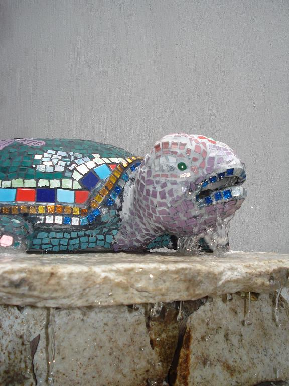 View of the turtle’s head from whose mouth the fountain water flows, similar to the dragon of the Guell Park, the turtle was built with tessalas of ceramic material and Murano glass, following the technique of the maestro Gaudí.